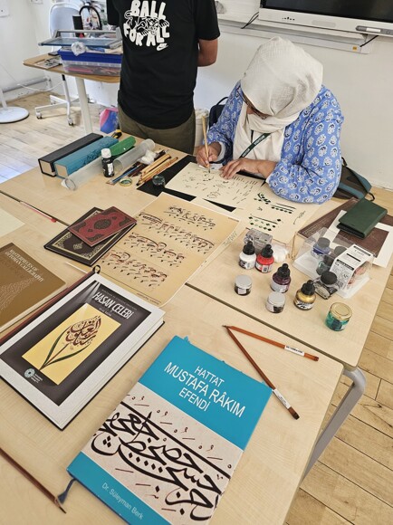 Their teacher for the day, Gulnaz Mehboob, was trained by the late Master Hasan Çelebi—widely respected as the Chief Master of Calligraphy (Reis ‘ul Hattatin). She guided students through the essential tools and techniques used in this ancient tradition.